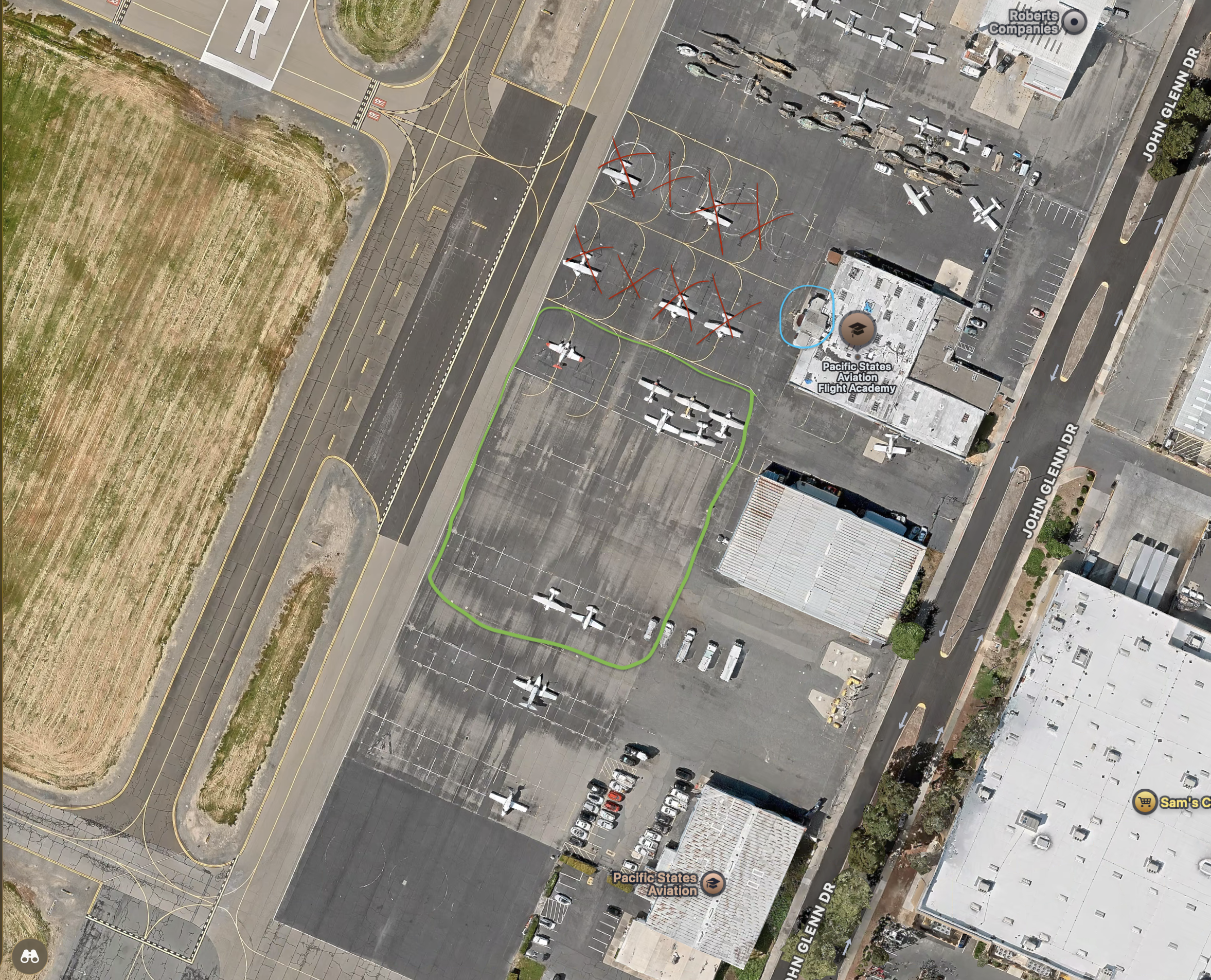 When you land, ask the tower to park at PSA. Please do not park in any spot marked with a red X. You can park in the area circled in green. My office is circled in blue.